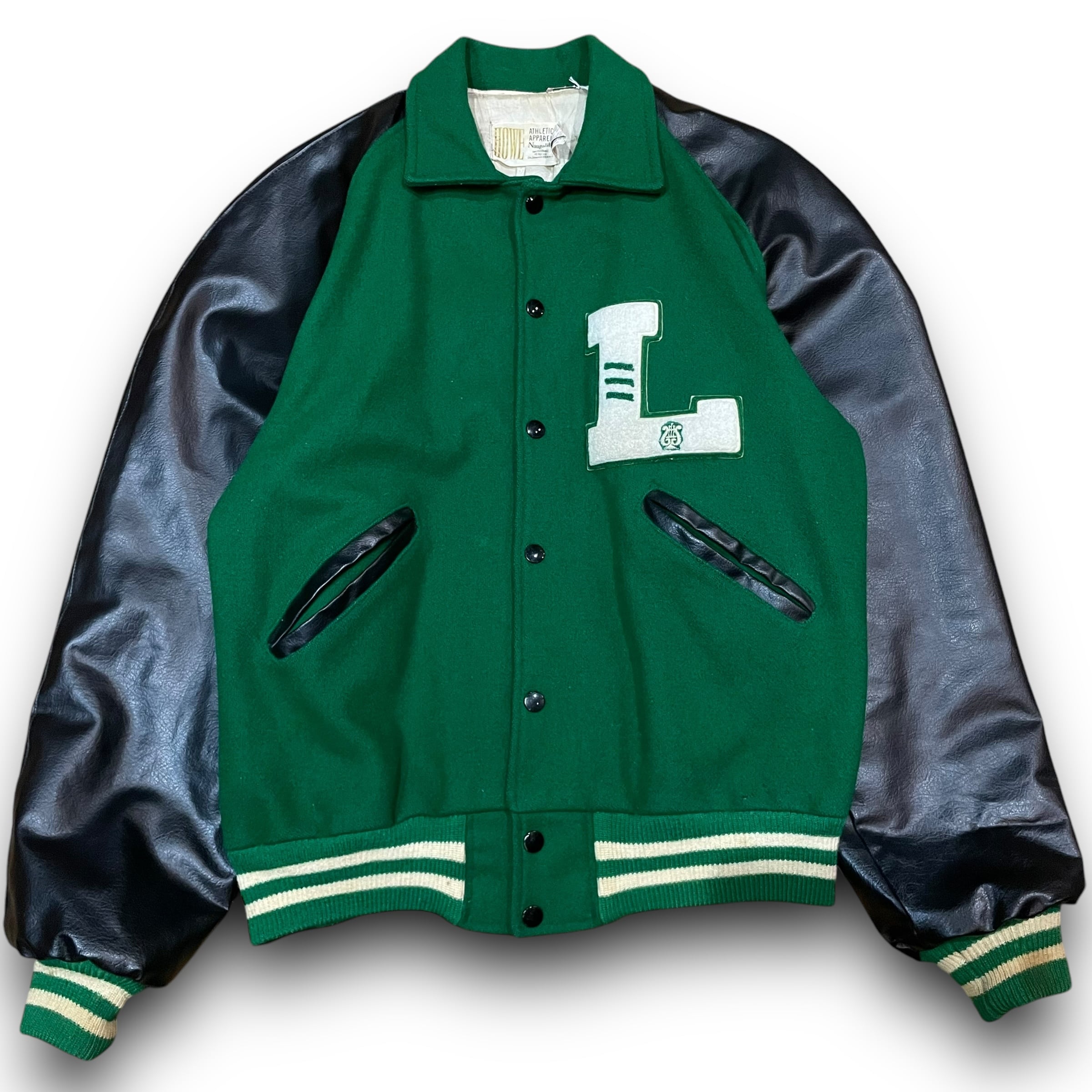 80年代 USA製 レザースタジャン ラグランスリーブ レザージャケット レザー切り返し ワッペン付き